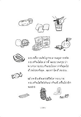ลองชี้ชวนให้ลูกหลานดูสารพัด ของกินได้เหล่านี้ และชวนคุยว่า พวกเขาชอบกินอะไรมากที่สุดไป ถึงน้อยที่สุด....และท�าไมถึงชอบ... แล้วหยิบดินสอสีให้เขาระบาย ของกินได้ให้มันน่ากินยิ่งขึ้นไปอีก นะเออ • 109 •